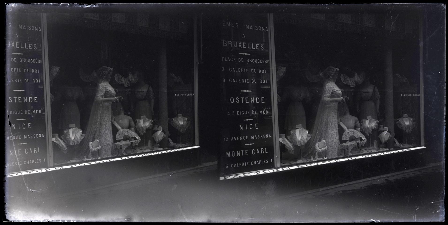 Vista de un escaparate de un comercio de encajes manufacturados en una localidad de Francia, posiblemente París. En primer término, el escaparate con un maniquí con vestido de encaje y varios bustos con cuellos de puntillas. En la parte inferior, un rótulo en el que se puede leer: FACTURE ROYALE DE DENTELLES, y en el cristal: MAN SPRICHT DEUTSCH. En la izquierda un rótulo: "(...) ÉMES MAISONS A BRUXELLES - PLACE DE BROUCKERE. 3 GALERIE DU ROI. 9 GALERIE DU ROI - OSTENDE 41ª DIGUE DE MER - NICE 18 AVENUE MASSENA - MONTE CARL 5 GALERIES CHARLES II"