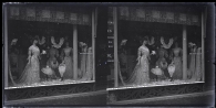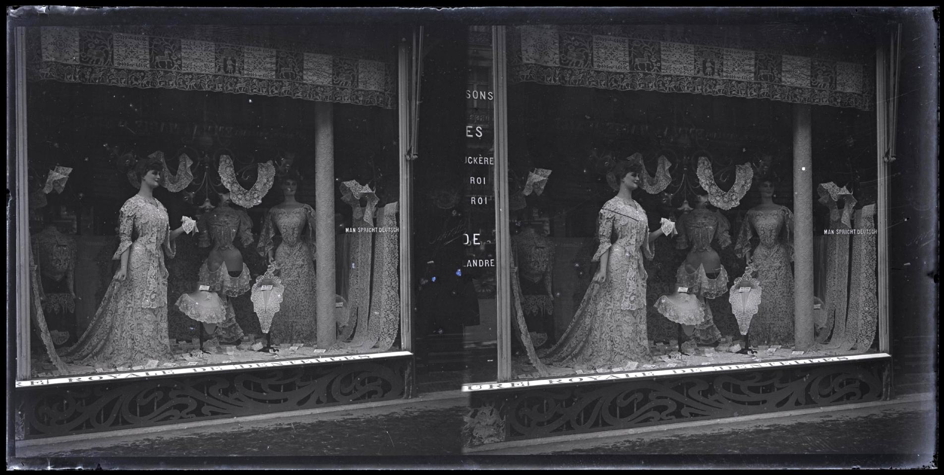 Vista de un escaparate de un comercio de encajes manufacturados en una localidad de Francia, posiblemente París. En primer término, el escaparate con 2 maniquíes con vestidos de encaje y varios bustos con cuellos de puntillas. En la parte inferior, un rótulo en el que se puede leer: ROYALE DE DENTELLES, en el cristal: MAN SPRICHT DEUTSCH y, debajo, una decoración de estilo modernista.
