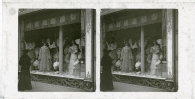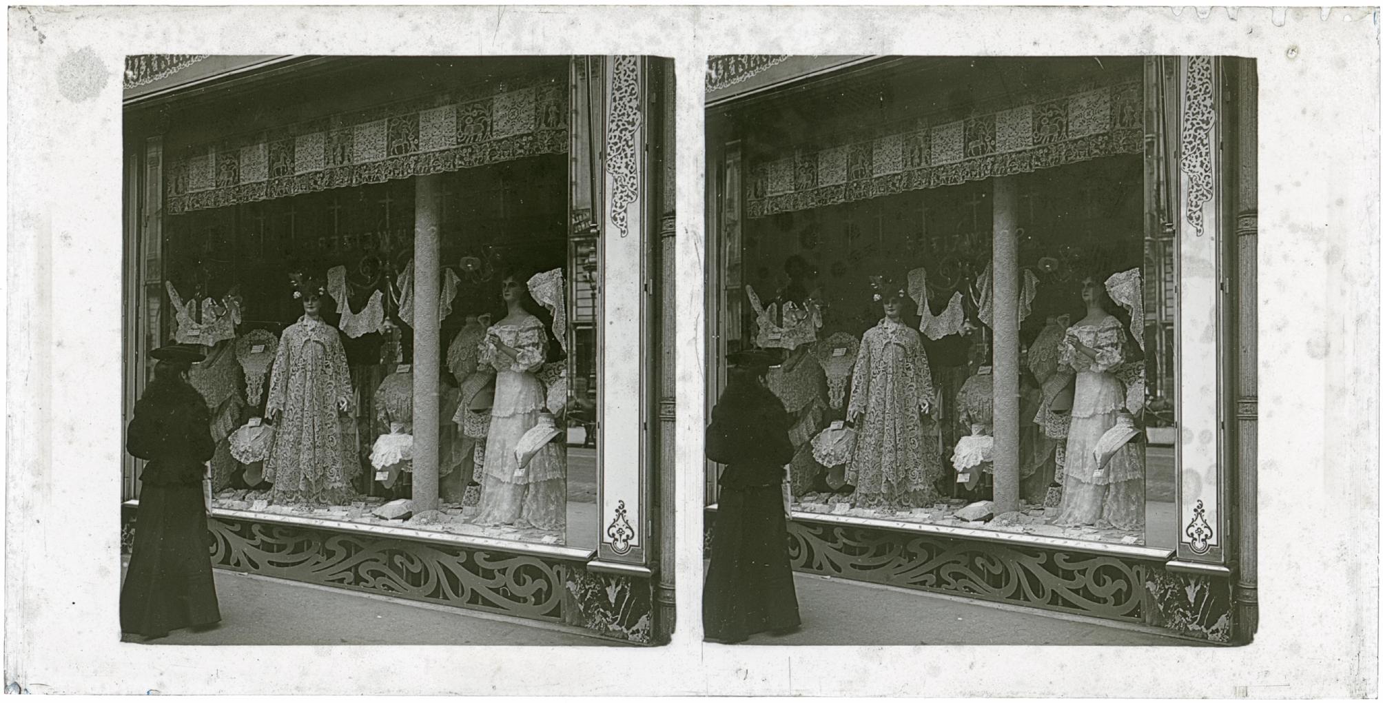 • Contenido: Vista de un escaparate de un comercio de encajes manufacturados en una localidad de Francia, posiblemente París. En primer término, una mujer de espaldas mira el escaparate. En segundo plano, el escaparate con 2 maniquíes con vestidos de encaje y varios bustos con cuellos de puntillas. En la parte inferior, un rótulo en el que se puede leer: MANUFACTORY y, debajo, una decoración de estilo modernista.