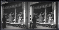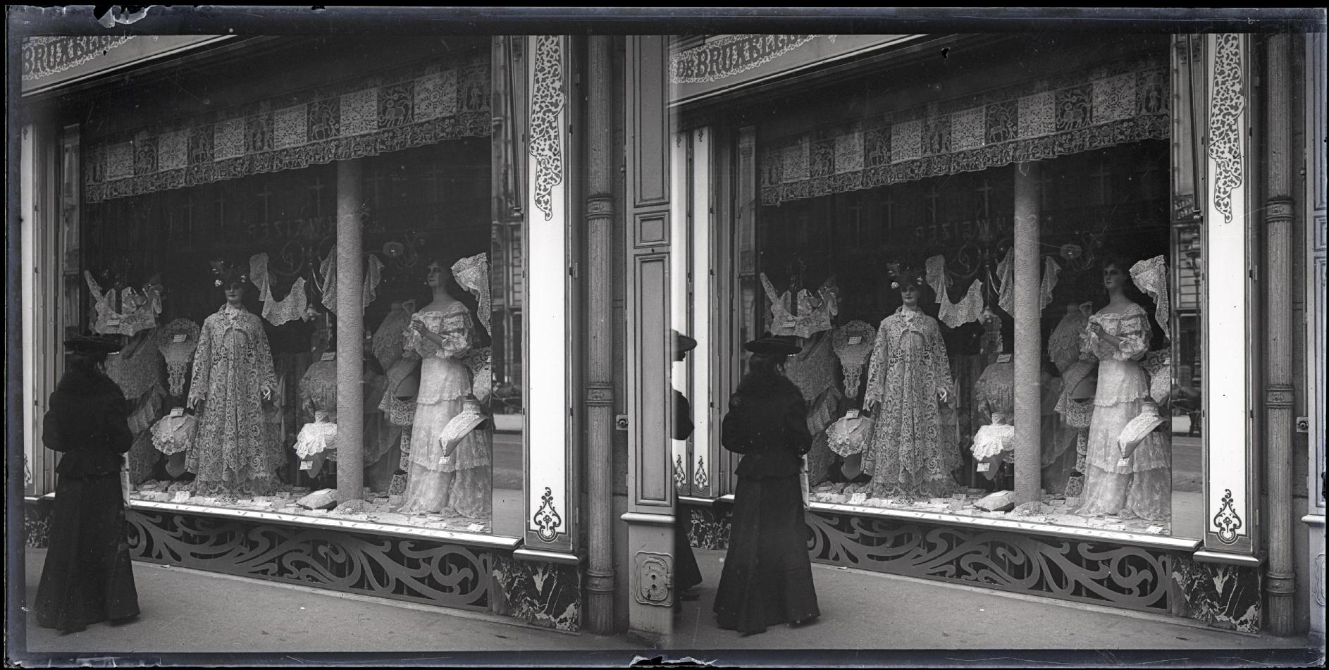 Vista de un escaparate de un comercio de encajes manufacturados en una localidad de Francia, posiblemente París. En primer término, una mujer de espaldas mira el escaparate. En segundo plano, el escaparate con 2 maniquíes con vestidos de encaje y varios bustos con cuellos de puntillas. En la parte inferior, un rótulo en el que se puede leer: MANUFACTORY y, debajo, una decoración de estilo modernista.