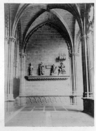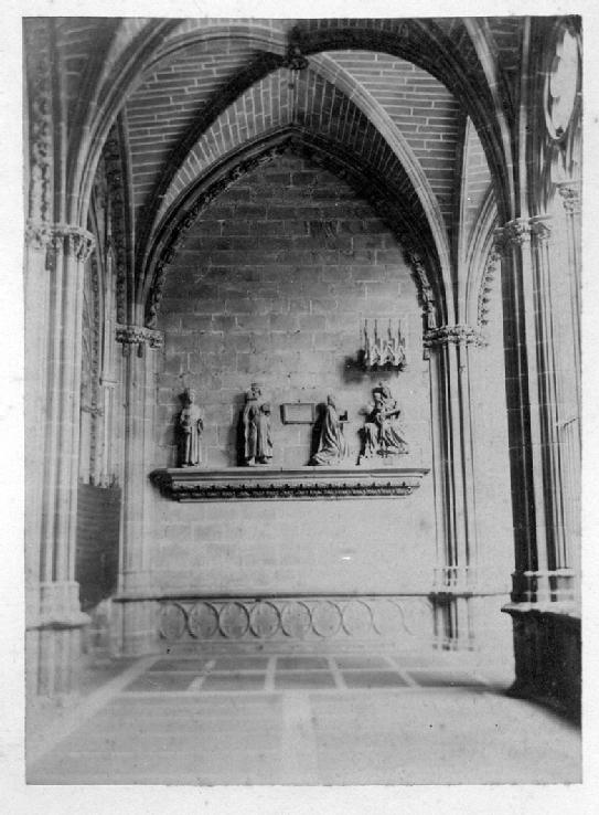 Escultura del claustro de la catedral de Pamplona. Grupo de la Epifanía, obra de Jacques Perut.