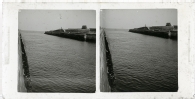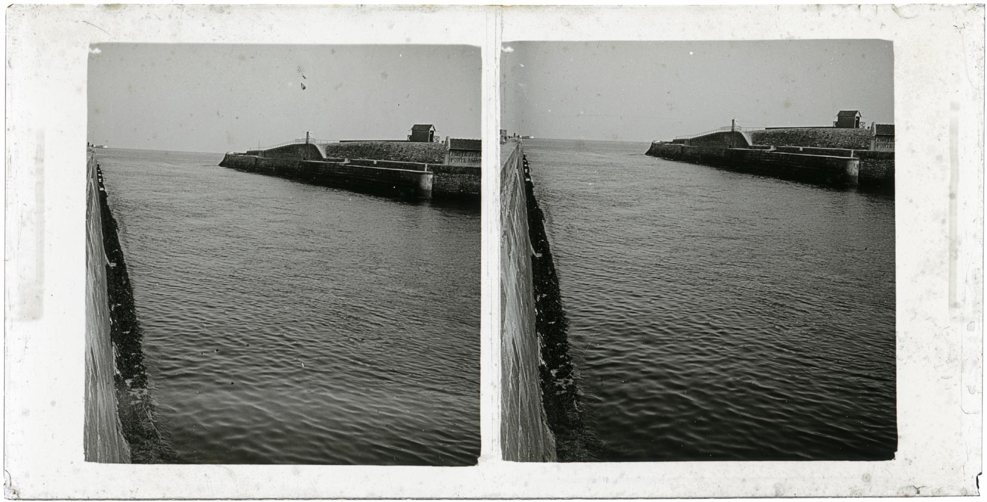 Vista del espigón del puerto de San Juan de Luz, departamento de Pirineos Atlánticos, tomada desde el sur en Ciboure. Sobre el espigón, una caseta y debajo, una edificación con un letrero de lectura incompleta "POSTE DE CA(...) / PORTE AMAR(...)"