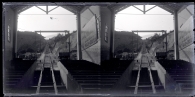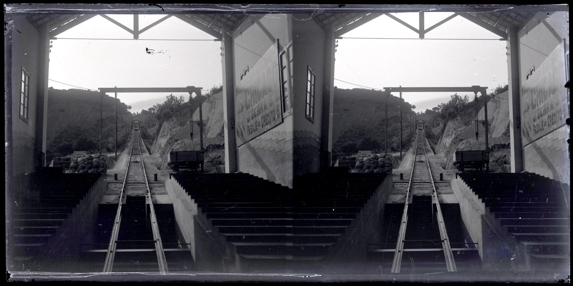 Vista de las vías del funicular del Tibidabo en Barcelona desde la estación de salida. En primer término, las vías del funicular y la estructura de la estación con un cartel en el que se lee "Maquinas de escribir Chicago, J. Serra S.C. Pasaje del Crédito, 5". En segundo plano, el funicular. Al fondo, la estación superior.