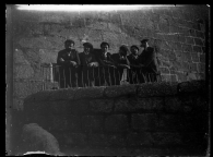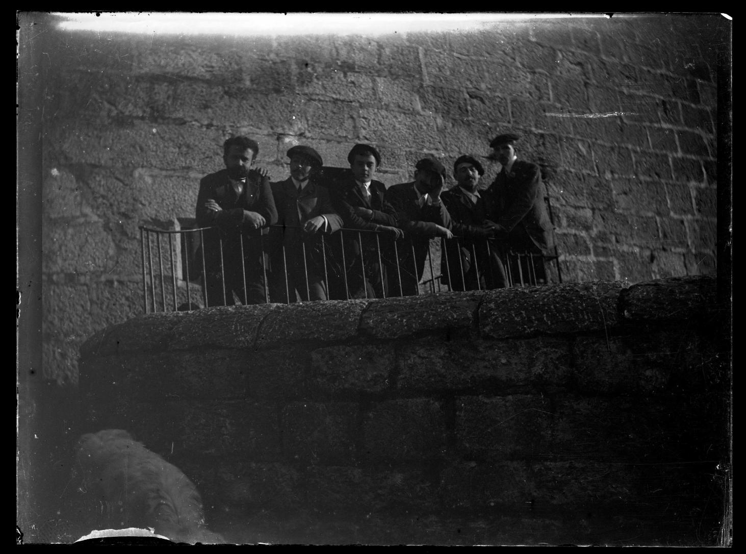 Retrato colectivo de 6 hombres jóvenes con traje y boina asomados a una barandilla en el exterior de un edificio de sillería.