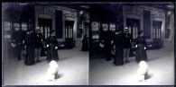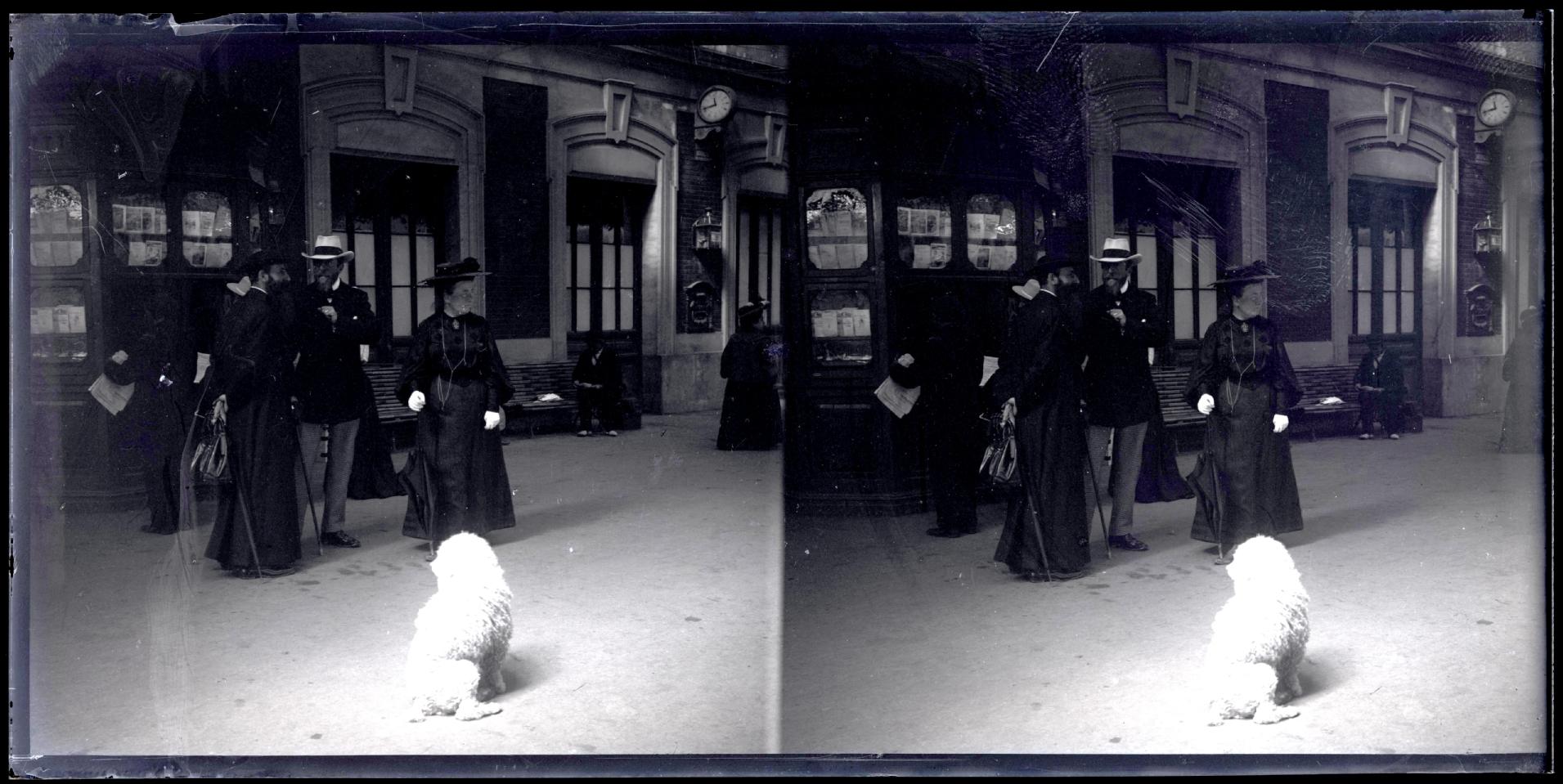 Escena de una mujer y 2 hombres hablando en el andén, junto al quiosco de revistas de la estación de tren de San Sebastián, Guipúzcoa. En primer término, un perro.