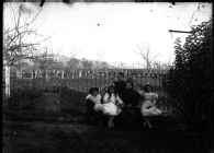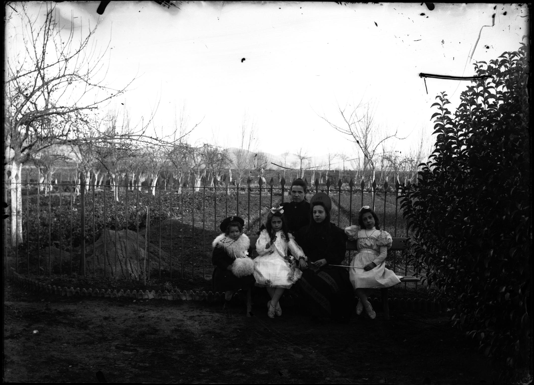 Retrato colectivo de un grupo familiar integrado por 3 niñas, una muchacha con cinta ["(...)NDACION(..)S (...) VALENCIA / (...)ATO DE CANOVAS"], diadema con fecha pintada ("1897") y fusta acompañadas por una mujer, tomado en el huerto de una casa de campo.