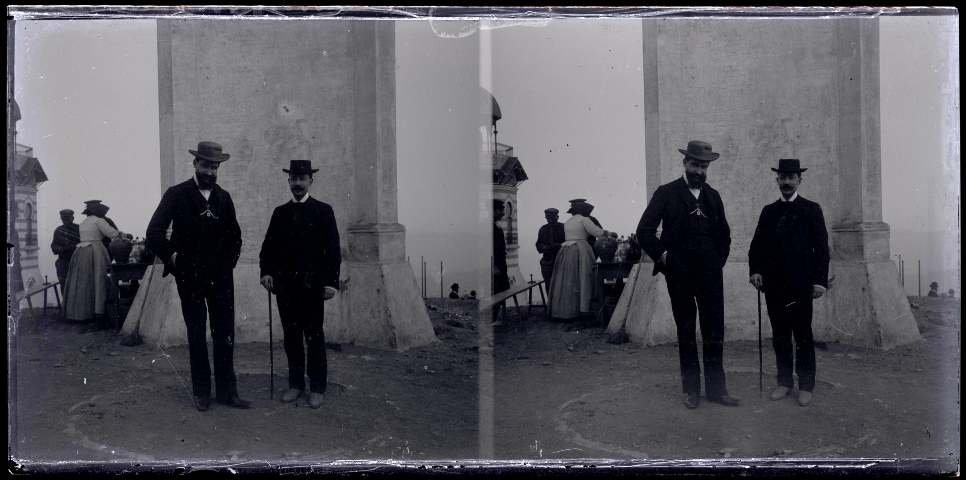 • Contenido: Retrato en plano entero de 2 hombres a los pies de una torres en el Tibidabo de Barcelona. Detrás, en la izquierda la torre del El Gran Café-Restaurante del Tibidabo.