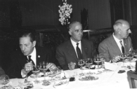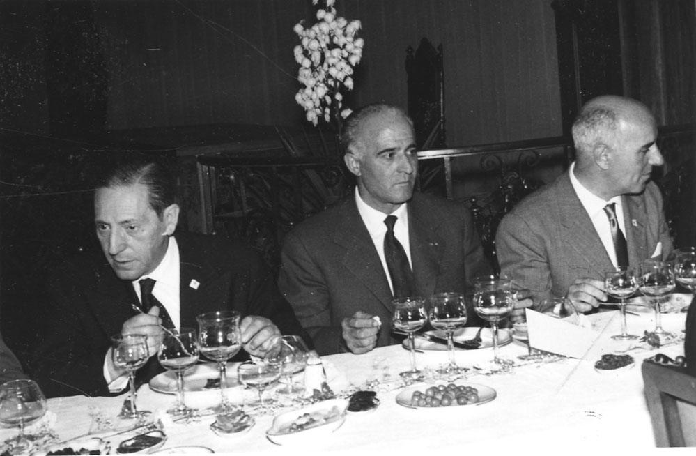 Vista parcial del banquete oficial ofrecido por la Diputación Foral a ancianos, autoridades e invitados a la fiesta de homenaje a la vejez en el Palacio de Navarra, en Pamplona. En primer término, sentados ante una mesa con servicio, un hombre con traje, el diputado Perfecto Ripa Fernández y otro hombre.