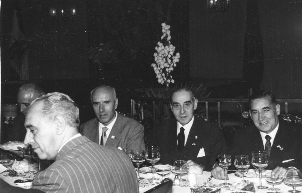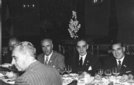 Vista parcial del banquete oficial ofrecido por la Diputación Foral a ancianos, autoridades e invitados a la fiesta de homenaje a la vejez en el Palacio de Navarra, en Pamplona. En primer término, de espaldas, el secretario de la Diputación, José Úriz Beriáin. Detrás, sentados ante una mesa con servicio, el diputado foral Perfecto Ripa Fernández, 2 hombres con traje, y el diputado Ambrosio Velasco Gómez.