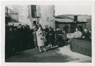Vista del público en el homenaje del ayuntamiento de Navascués al maestro Jesús Lacasia Redín celebrado en la localidad de Aspuz. De pie, una mujer hablando a la presidencia del acto que se encuentra en la derecha. En segundo plano, el público en la calle delante de la fachada de una casa con el cartel de "TELEFONOS".