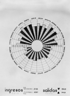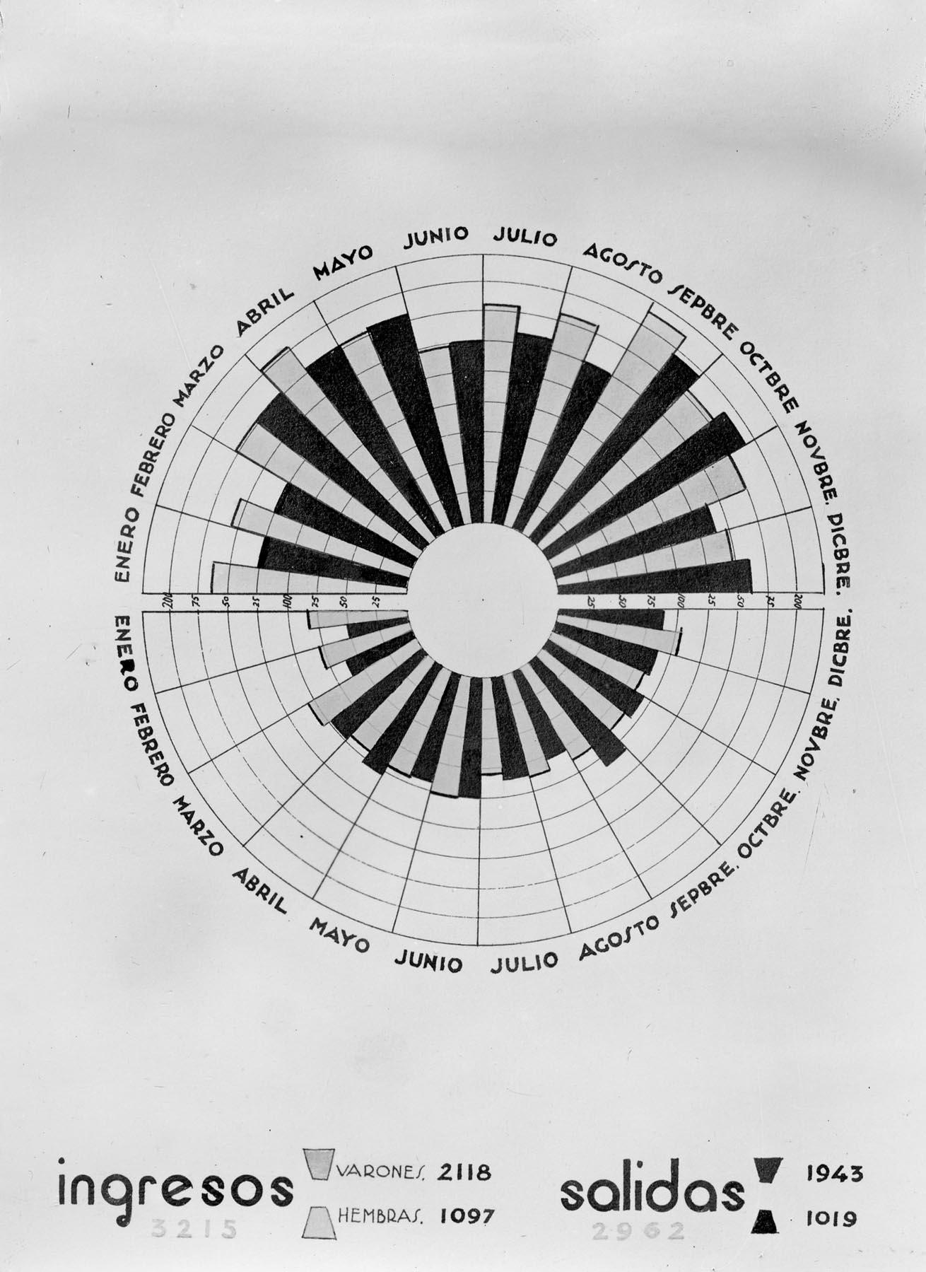 Gráfico circular de ingresos y salidas de enfermos en el Hospital de Navarra, en Pamplona, durante el ejercicio contable de 1935, con representación de barras de acuerdo a las cifras totales de movimientos por meses del año clasificadas por sexos.