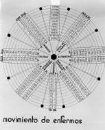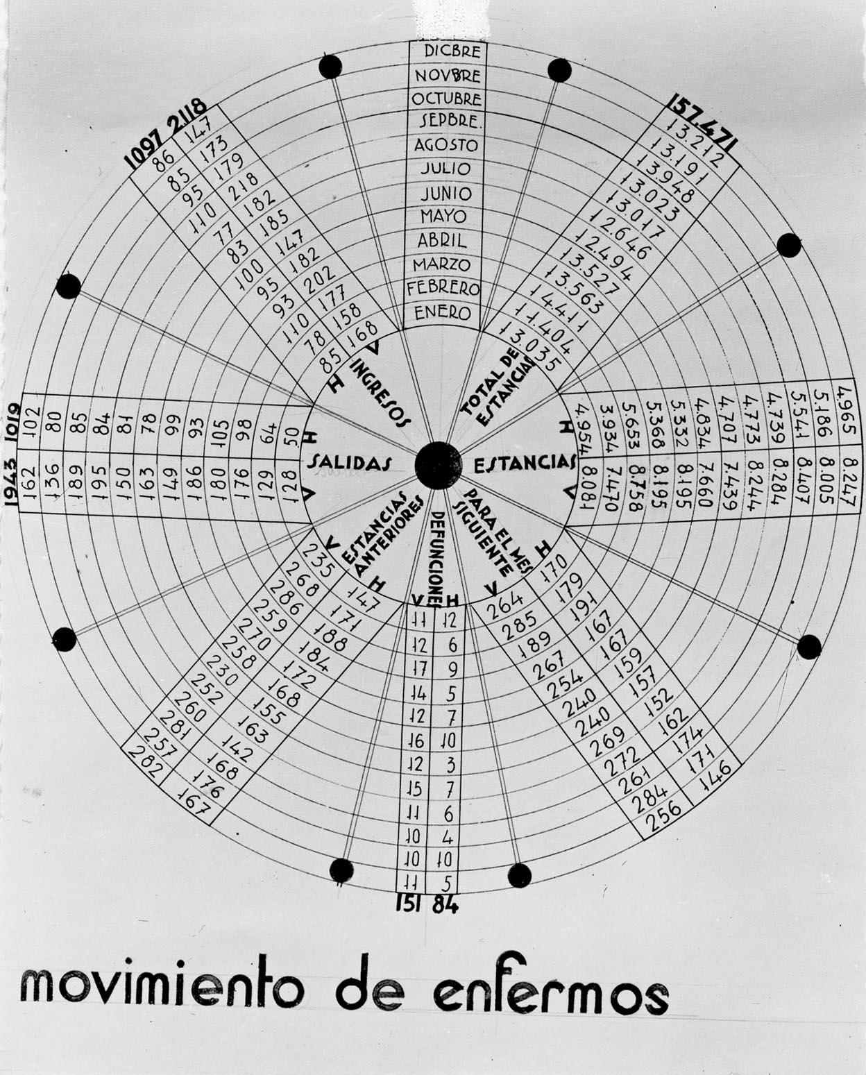 Gráfico circular con representación del movimiento de enfermos del Hospital de Navarra, en Pamplona, durante el ejercicio contable del año 1935. De forma concéntrica, datos correspondientes a los 12 meses del ejercicio. De forma concéntrica, columnas para la clasificación de movimientos por ingresos, salidas, estancias anteriores, defunciones, para el mes siguiente, estancias y total de estancias, dividas por sexos.