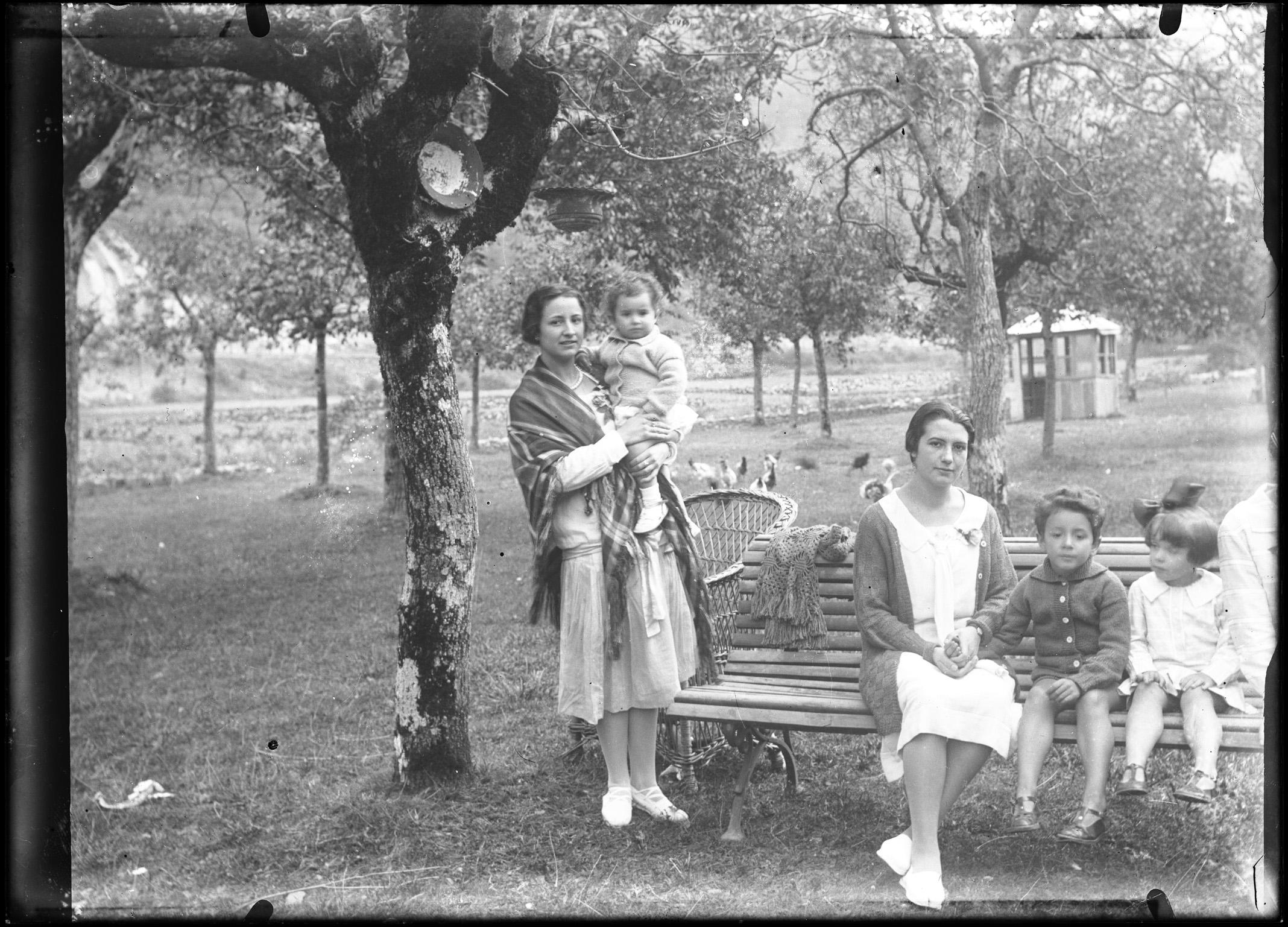 Retrato colectivo de un grupo de muchachas y niños tomado en el jardín de la fábrica de Pastaola en Latasa, en el valle de Imoz. En la izquierda, Jenara con María Teresa Berazaluce Altadill en brazos, y en el banco Miguel María y Ana María Berazaluce Altadill, con su tía María del Carmen Altadill Aldave.
