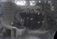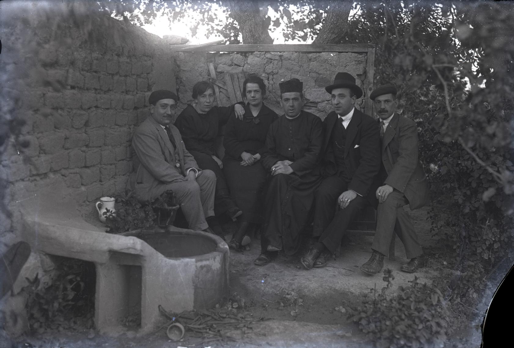 Retrato en plano entero de un grupo de personas en un patio con árboles. De izquierda a derecha, un hombre, Ramona Erro, una mujer, un sacerdote, José Martínez Berasían y un hombre. En la izquierda una fuente con pila de piedra para lavar, de fondo un muro de adobe y un árbol.
