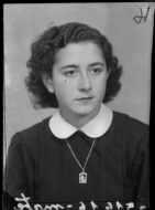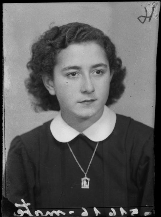Retrato de estudio en plano medio corto de una muchacha con uniforme de novicia de una congregación religiosa femenina y medalla.