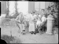 Retrato colectivo de los hermanos Juana María, Manuel y Francisco Altadill Aldave junto a su hermana pequeña María del Carmen, sentada sobre una silla, acompañados por Miguel Berazaluce Elcarte (primero por la izquierda), en el jardín de "Garden House", la casa de recreo de la familia Altadill Aldave situada en el paraje de La Magdalena en Pamplona.