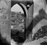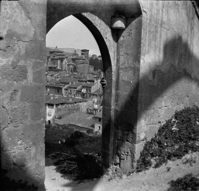 Vista de la iglesia de San Miguel de Estella tomada a través de un arco apuntado del convento de Santo Domingo. En primer término, el arco de ojiva en piedra. En segundo plano, las casas de la calle de la Rúa y del entorno del río Ega. Detrás, la iglesia de San Miguel y, al fondo, en la derecha, el ábside de San pedro de Lizarra.