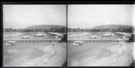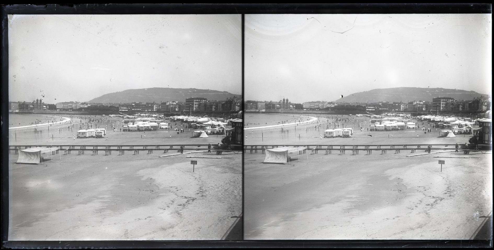 Vista de la playa de La Concha en la ciudad de San Sebastián, Guipúzcoa, tomada desde el este. En primer término, una pasarela sobre la arena. Detrás, las casetas de baño y los bañista. En el siguiente plano, los jardines de Alderdi Eder y, en la izquierda, el casino, actual casa consistorial. Al fondo, el monte Ulía.