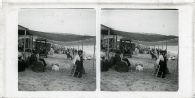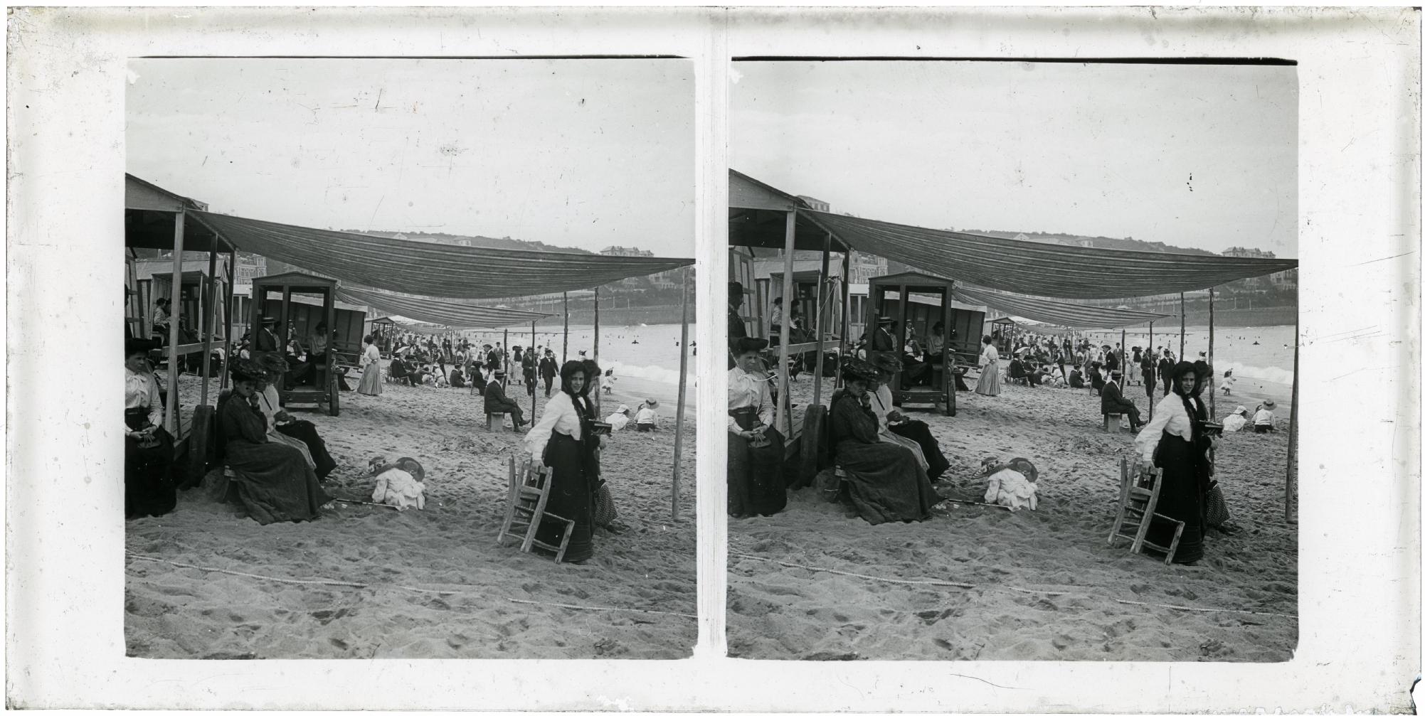 Vista de la playa de La Concha de la ciudad de San Sebastián con casetas y toldos. En primer término, 4 mujeres sentadas baja un toldo y 2 niñas jugando en la arena.