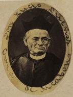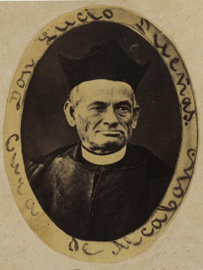 Retrato de estudio en plano medio corto del sacerdote y guerrillero carlista Lucio Dueñas, apodado "el Cura de Alcabón", con sotana y bonete.Alrededor de la imagen, leyenda: "Don Lucio Dueñas / Cura de Alcabón".