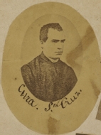 Reproducción de una fotografía de Ferdinand Bérillon con retrato en plano medio corto del sacerdote y guerrillero carlista Manuel Ignacio Santa Cruz Loidi, apodado "el Cura Santa Cruz", afeitado y en hábito eclesiástico.Bajo la imagen, leyenda: "Cura S[an]ta Cruz".