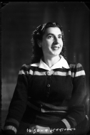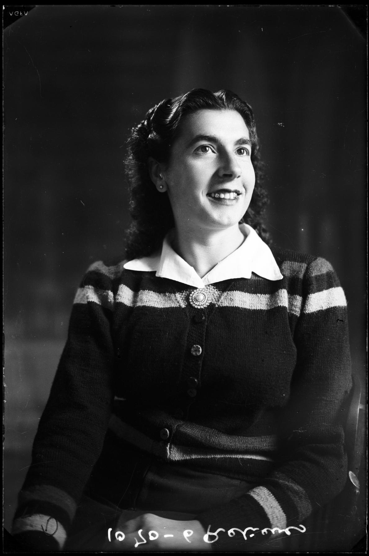 Retrato de estudio en plano medio de una muchacha sentada, vestida con blusa y chaqueta de punto con broche.