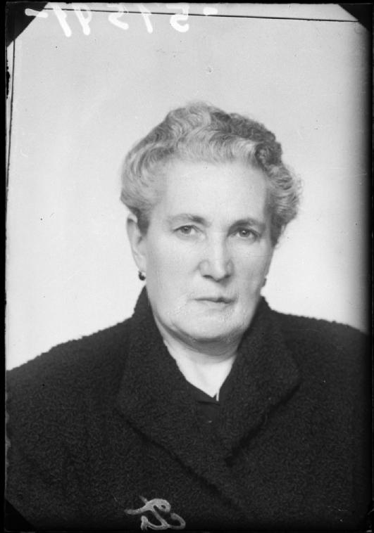• Contenido: Retrato de estudio en plano medio corto para Documento Nacional de Identidad de una mujer de edad avanzada con abrigo oscuro.