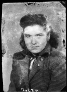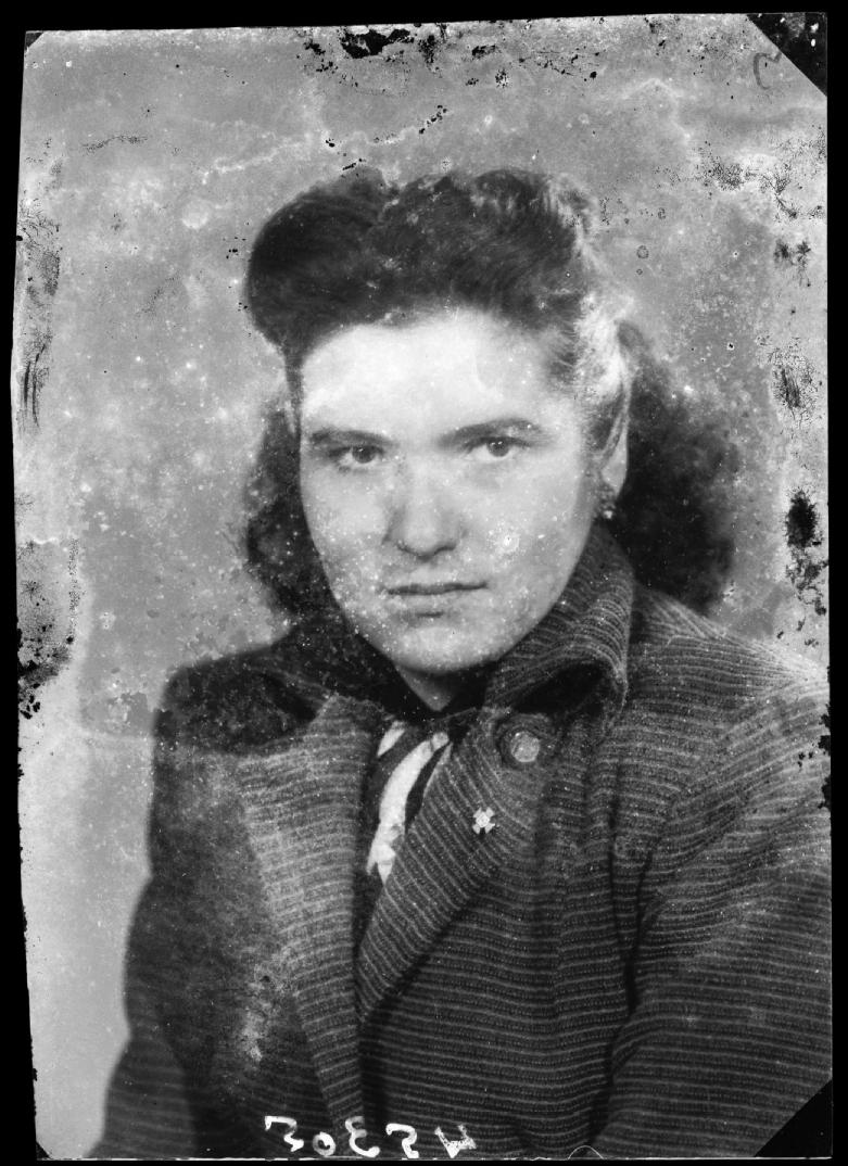 • Contenido: Retrato de estudio en plano medio corto de una mujer con abrigo y emblema en la solapa.