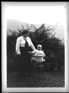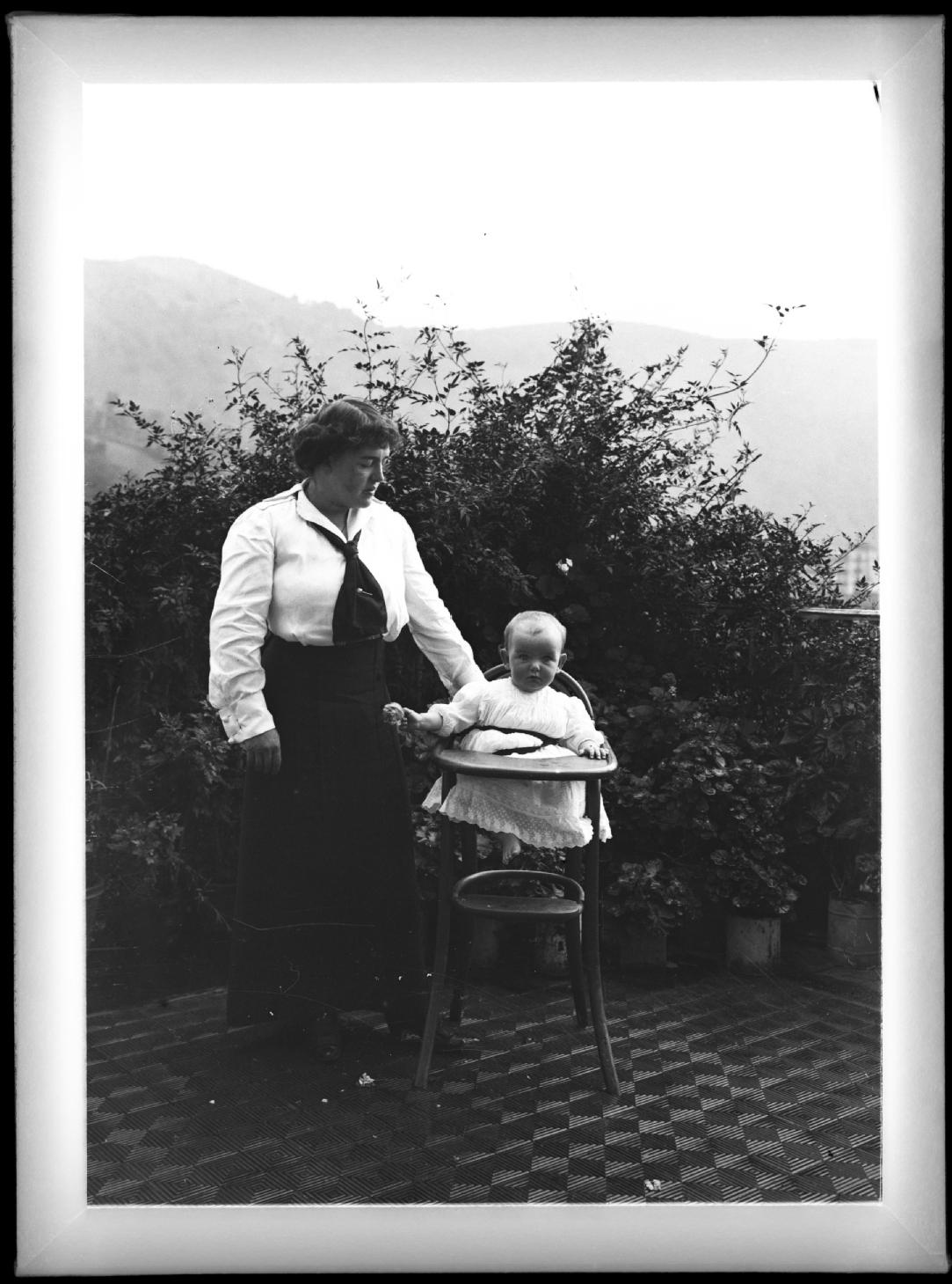 Retrato en plano entero de una mujer y una niña en una trona en la terraza de una casa en Oronoz Mugaire (Navarra).