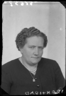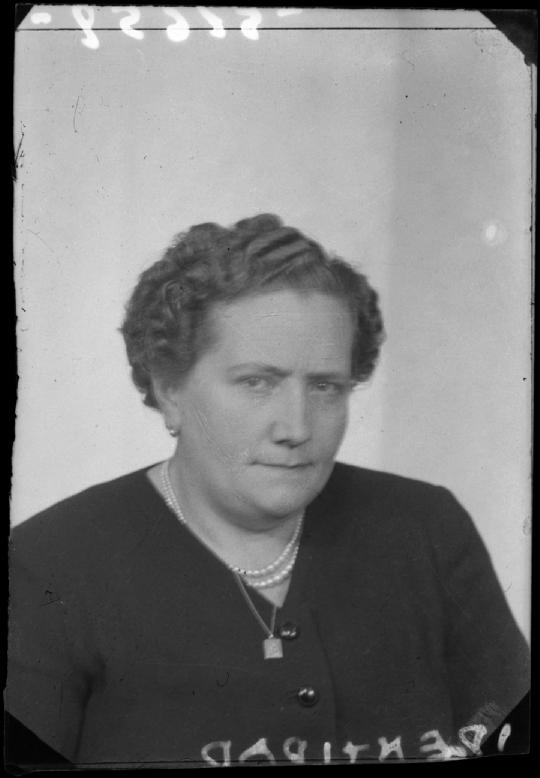 Retrato de estudio en plano medio corto para el Documento Nacional de Identidad de una mujer de mediana edad con vestido oscuro, collares de perlas y medalla.