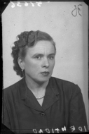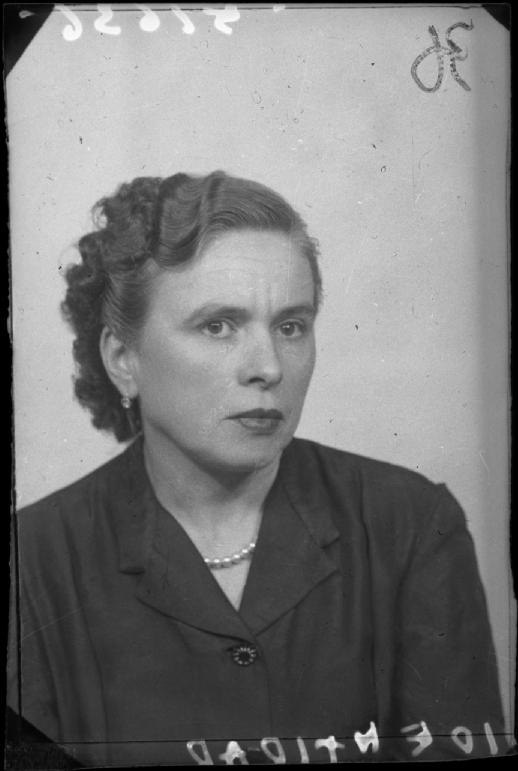 Retrato de estudio en plano medio corto para el Documento Nacional de Identidad de una mujer de mediana edad con vestido oscuro y collar de perlas.