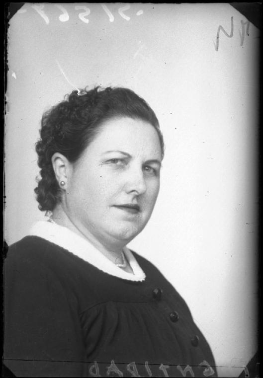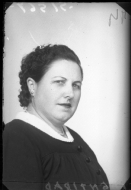 Retrato de estudio en plano medio corto para Documento Nacional de Identidad de una mujer de mediana edad con vestido oscuro y pendientes y collar de perlas.