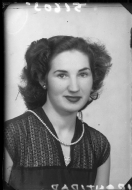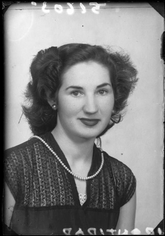 Retrato de estudio en plano medio corto para Documento Nacional de Identidad de una mujer joven con vestido de encaje y collar de perlas.