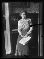 Retrato en plano entero de una mujer joven del entorno de la familia Iraizoz Astiz, sentada junto a un piano y con un periódico en las manos.