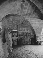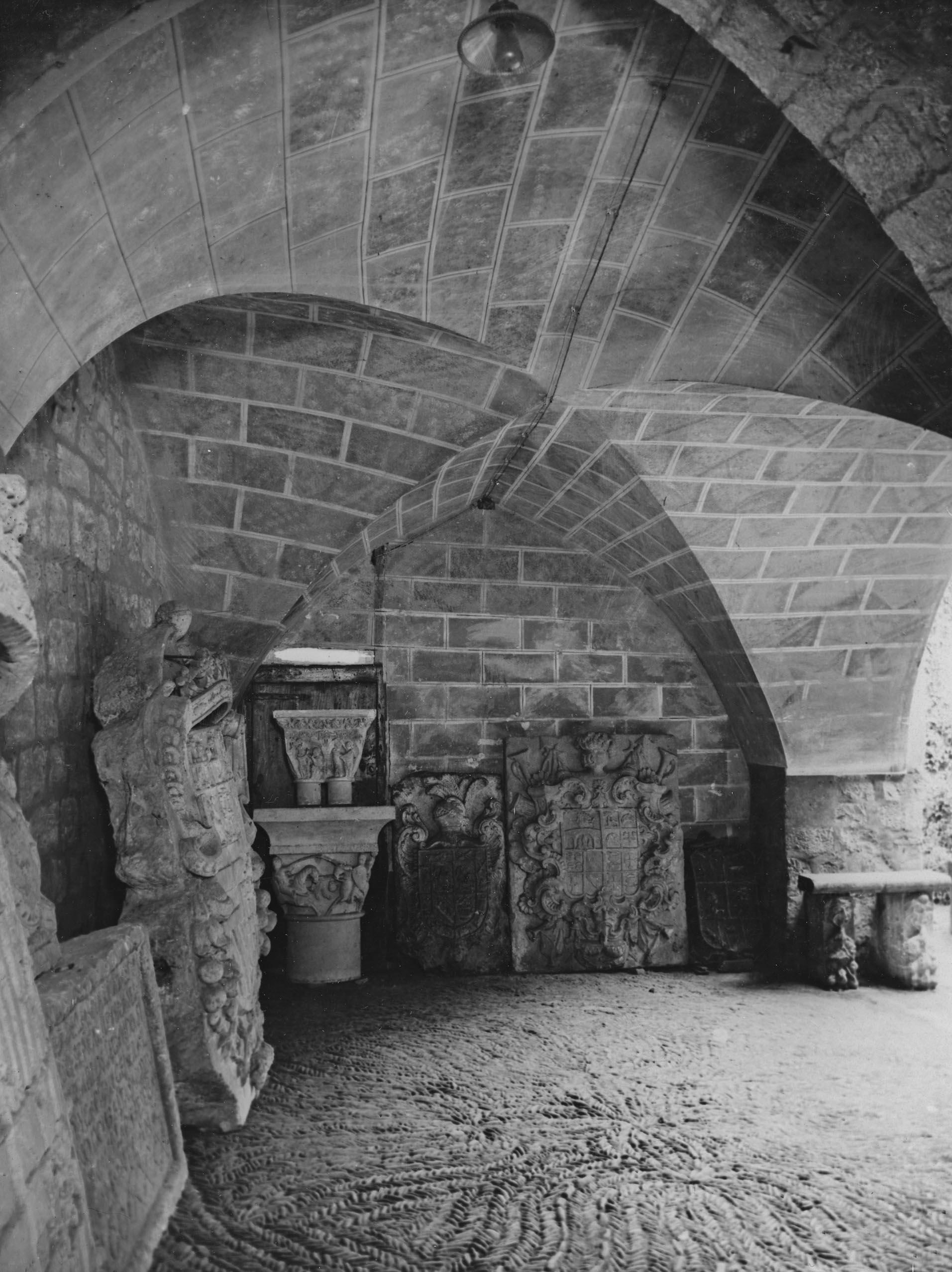 Vista parcial del zaguán del Museo arqueológico y artístico de la Comisión de Monumentos Históricos y Artísticos de Navarra, ubicado en la antigua Cámara de Comptos de Pamplona, en la calle Ansoleaga. Sobre el pavimento de cantos rodados del zagüán de entrada al edificio, diversos escudos, una inscripción de las fortificaciones de Pamplona y reproducciones en yeso de capiteles del palacio de los reyes de Navarra y el claustro de San Pedro de la Rúa en Estella.