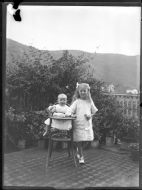 Retrato en plano entero de 2 niñas, una sentada en una trona y la otra en pie con una flor en la terraza de una casa en Oronoz Mugaire (Navarra). En segundo plano, el palacio de Reparacea.