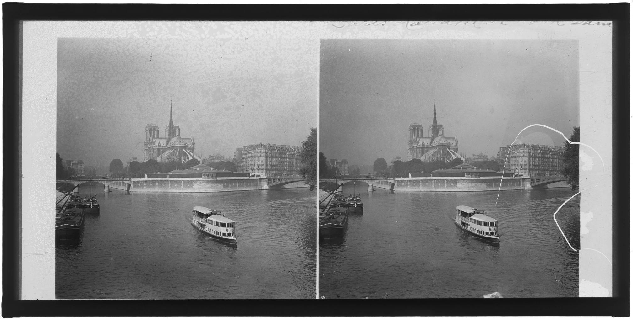 En el anverso, en el margen superior, anotación identificativa manuscrita: "París. Catedral de N. Dame". En el reverso, desprendimiento parcial de la emulsión. Restaurada en 2017. La imagen es anterior a la desaparición de la antigua morgue en 1914. Debió de ser adquirida por Julio Altadill en un viaje a la capital francesa junto a la imagen FOT_ALTADILL_C_049.