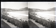 Vista de la playa y bahía de La Concha de San Sebastián, tomada desde el sureste. En primer término, el paseo y las casetas de baño sobre la arena de la playa. Al fondo, el seminario, el palacio de Miramar y, en la derecha, el monte Igueldo.