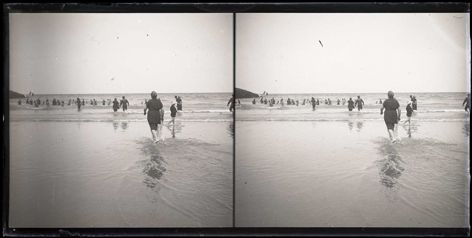 • Contenido: Vista de una playa de la costa vascofrancesa. En primer término una mujer camina hacia el agua. En segundo plano, un gran número de personas en el agua.