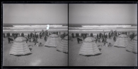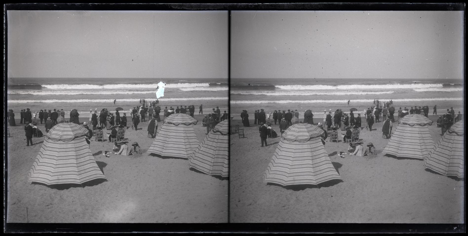 Vista de una playa de la costa vascofrancesa. En primer término 3 sombrillas y un grupo de personas en la arena. En segundo plano, un gran número de personas con sombrilla y sentadas en sillas mirando al mar. Al fondo, otro grupo numeroso en el agua.