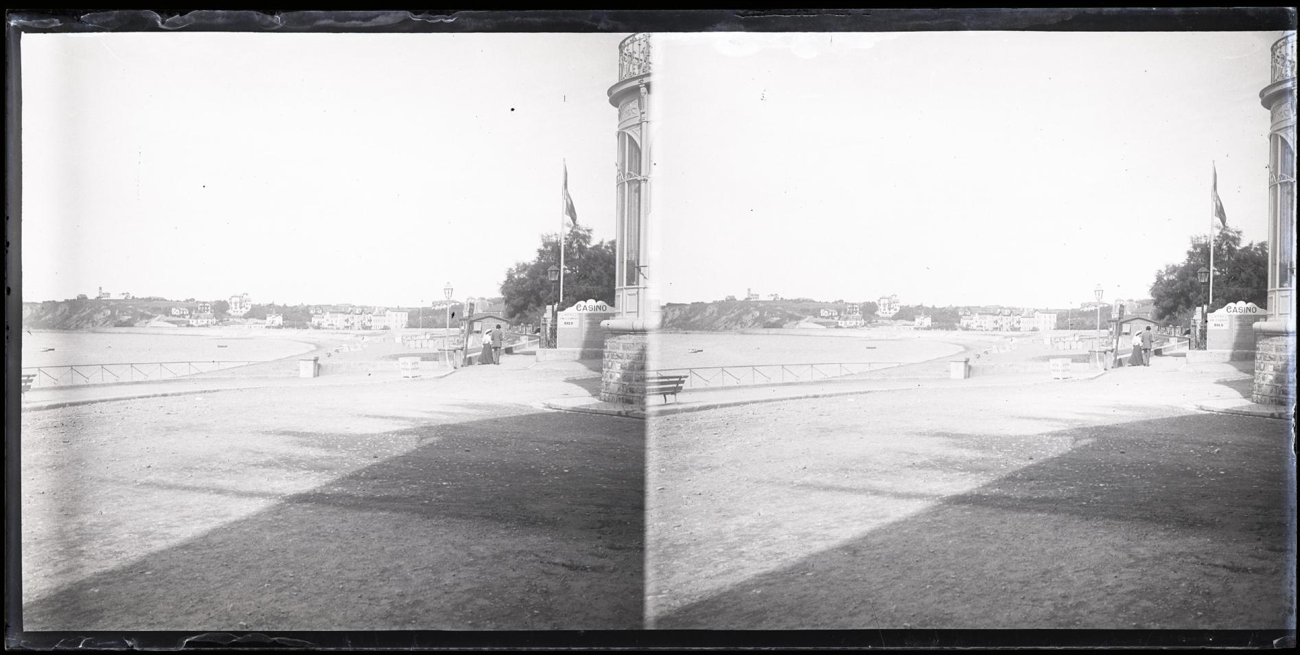 • Contenido: Vista de la una playa de una localidad vascofrancesa. En primer término, la entrada a un casino. En segundo plano, la playa y, al fondo, la costa.