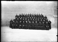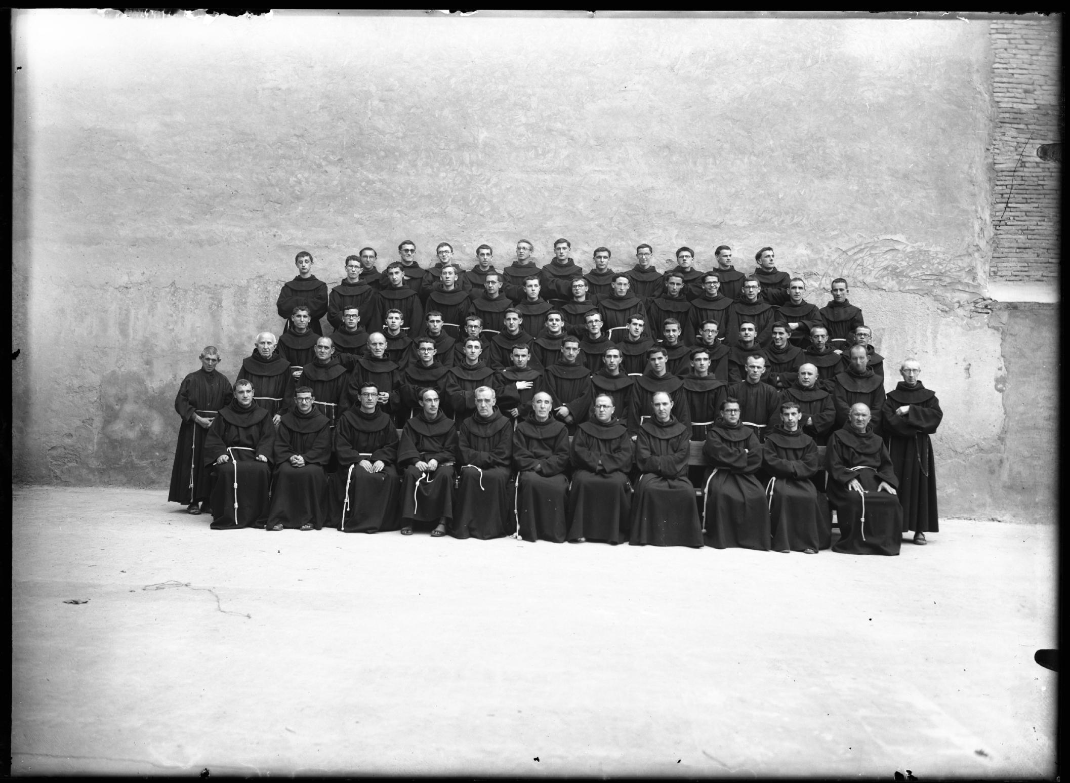 Retrato colectivo de una promoción de novicios del colegio-seminario de Teología del convento de Capuchinos Extramuros en Pamplona acompañados por algunos de sus profesores, todos ellos con hábito de la orden.