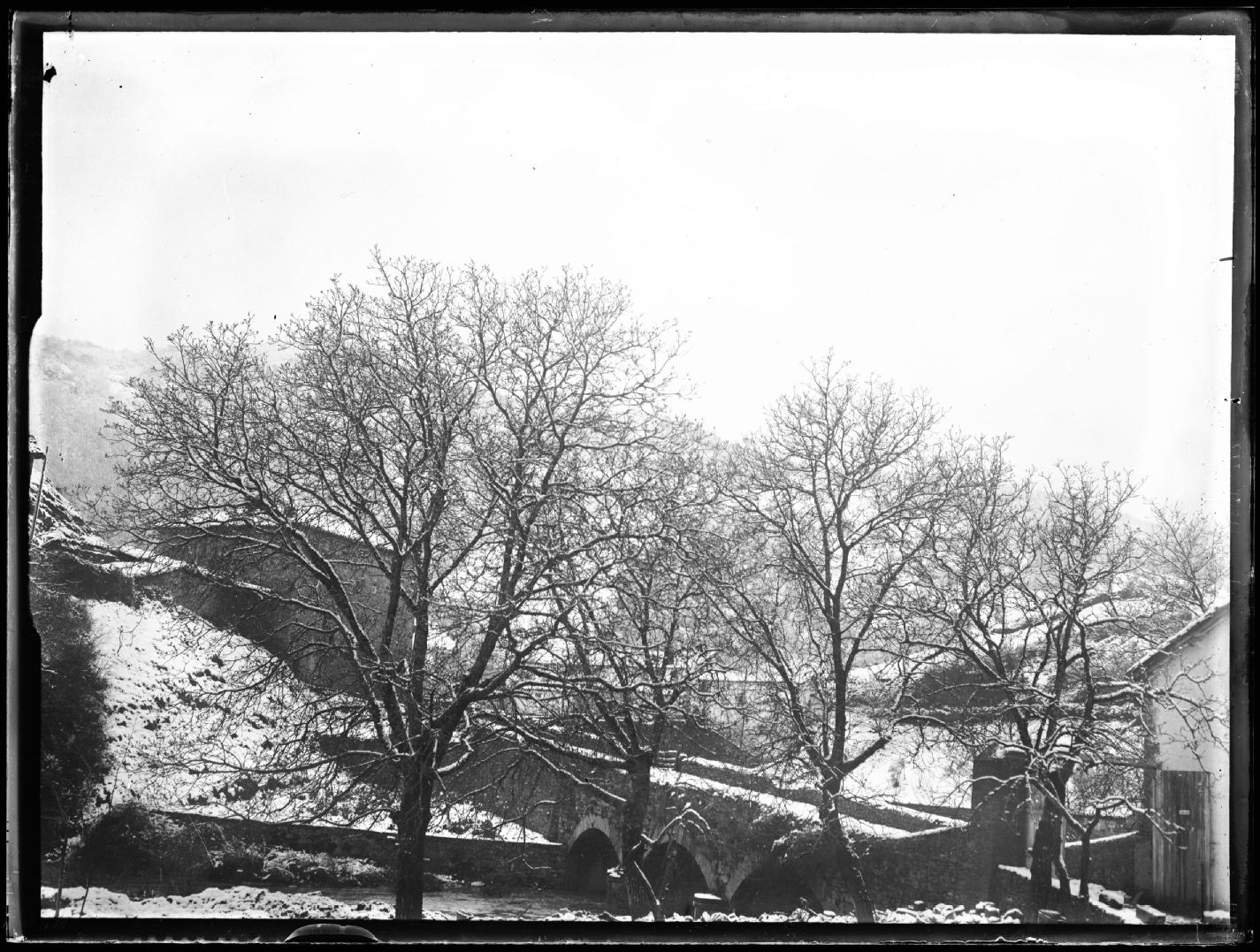 Puente de acceso a la fábrica de Pastaola en Latasa (Imoz) sobre el río Larráun tras una nevada.