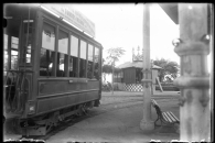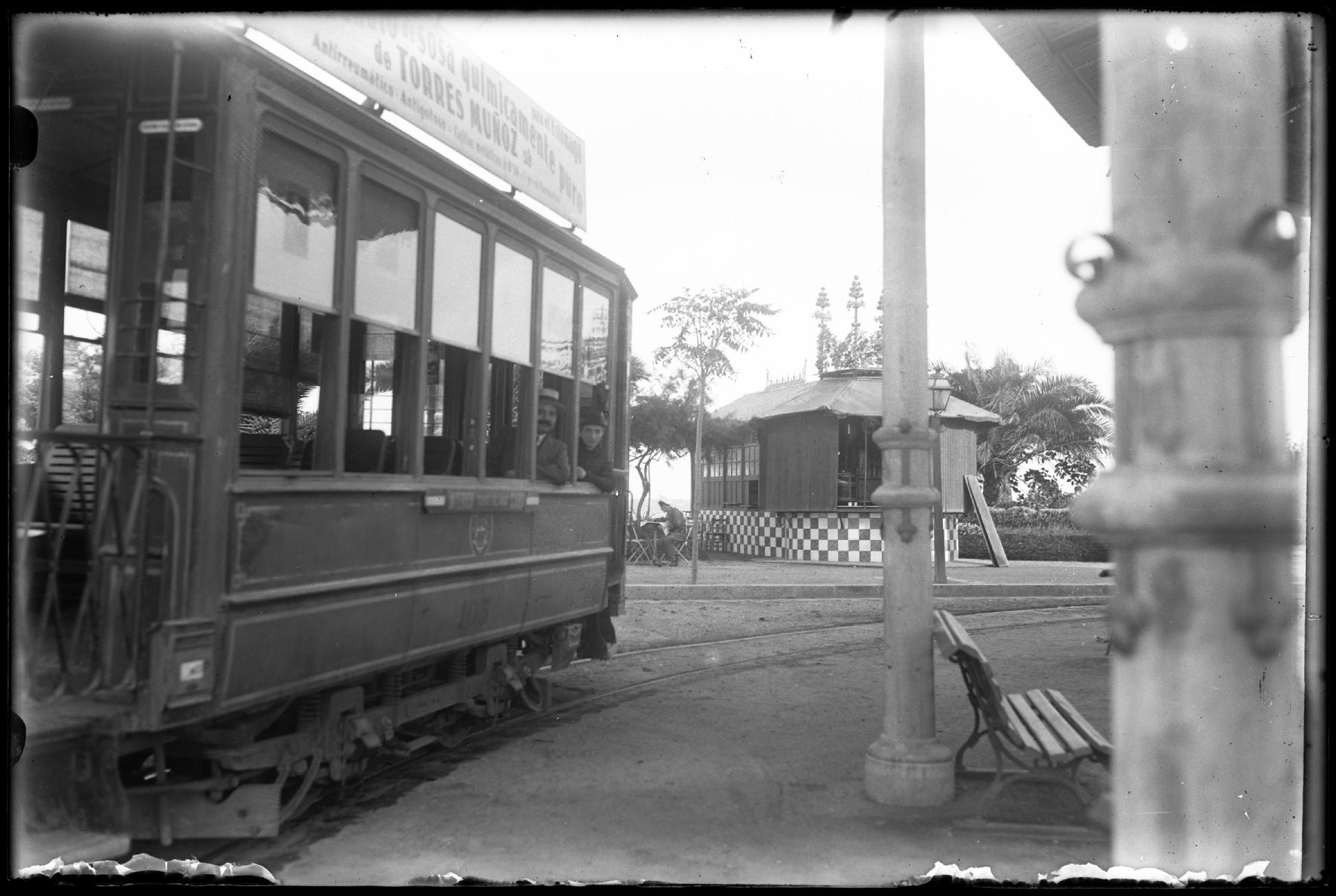 Escena de Ramona Erro Cía, mujer de José Martínez Berasáin, con un hombre sentados en un tranvía en el paseo de Poniente de Valencia, posiblemente en la rotonda de Caro junto a un quiosco. Sobre el tranvía el letrero: (...) de sosa quimicamente puro / de Torres Muñoz S.L.