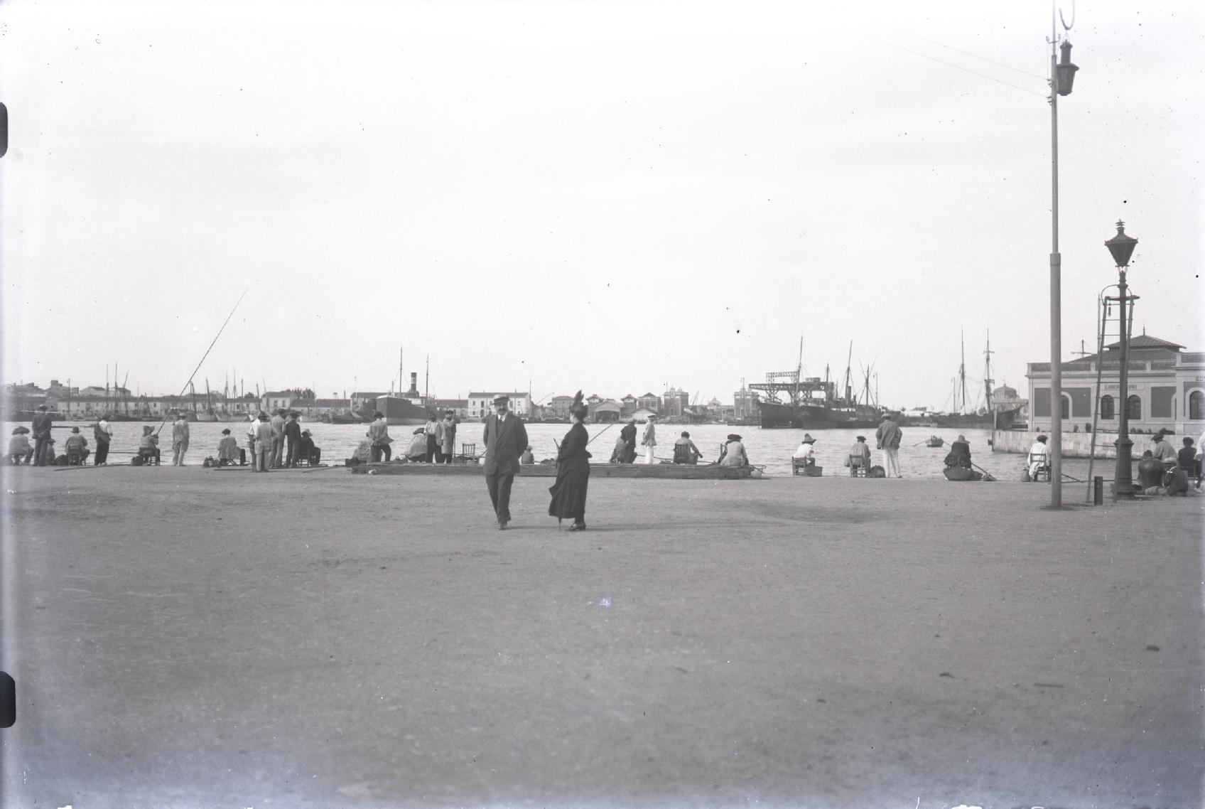 Retrato en plano entero de Ramona Erro, mujer de José Martínez Berasáin, en el puerto del Grau de Valencia. En el centro de la imagen Ramona, de espaldas, junto a un hombre, en segundo plano 33 hombres pescando y contemplando la pesca, en la derecha el antiguo edificio del laboratorio portuario, al fondo, otros edificios del puerto como el varadero.