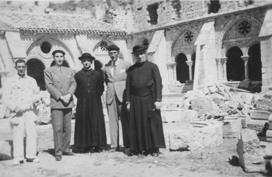 Retrato de grupo de plano entero de 5 hombres en el claustro del monasterio de Santa María la Real de Iranzu (Abárzuza) durante la restauración realizada por la Institución Príncipe de Viana. De izquierda a derecha, un hombre; José Yárnoz Larrosa, arquitecto responsable de Restauración de la Institución Príncipe de Viana; un sacerdote; el ingeniero Manuel Sainz de los Terreros, subdirector de Caminos; y otro sacerdote. Junto a ellos, por el suelo, elementos y fragmentos de piedra recuperados para la restauración. Al fondo, el ángulo noroeste del claustro.
