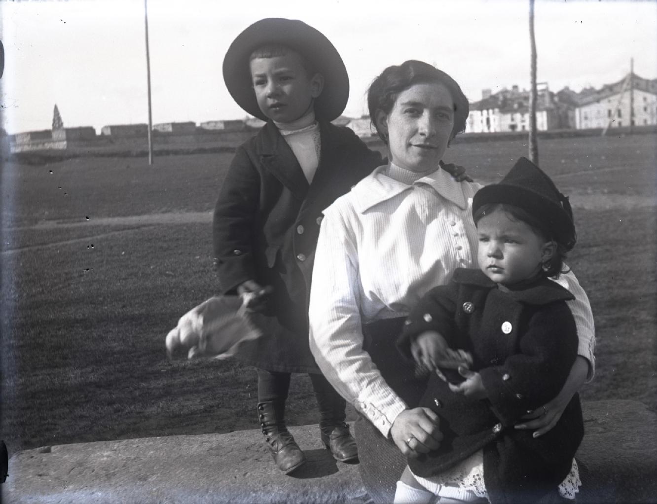 Plano medio de Ramona Erro, mujer de José Martínez Berasáin, con su hija Margarita sentada en su regazo y su hijo Luis de pie detrás de ella. Al fondo la muralla del baluarte de la Reina, hoy desaparecido, y las fachadas de las casas de la actual calle Labrit de Pamplona.