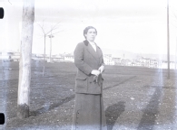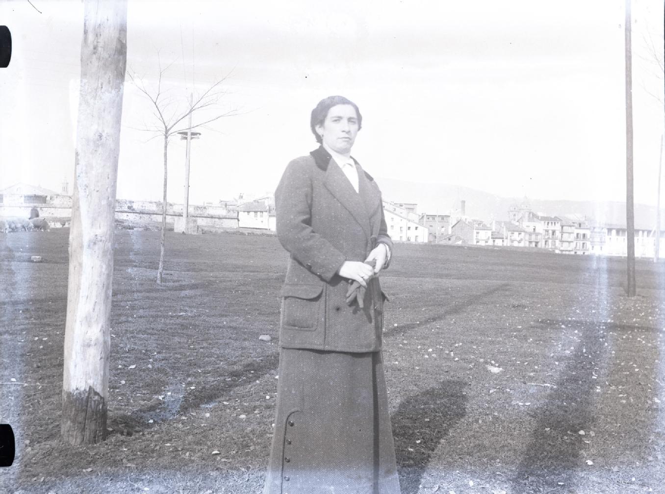 Retrato en plano americano de Ramona Erro, mujer de José Martínez Berasáin, en el la zona de la actual plaza de toros de Pamplona. En segundo plano el desaparecido baluarte de la Reina y las fachadas de las casas de la calle Labrit; detrás, en la izquierda, la trasera del antiguo teatro Gayarre y una de las torres de la iglesia de San Cernin; en la derecha las torres de la catedral y la de la iglesia de San Agustín. Al fondo el monte San Cristóbal - Ezkaba.