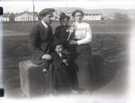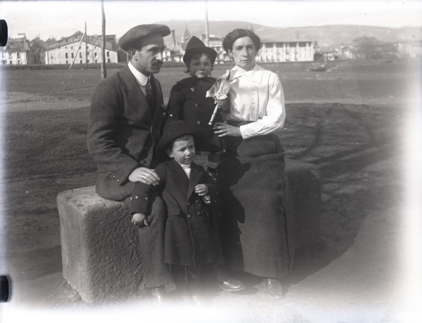 Retrato en plano entero de la familia Martínez Berasáin - Erro. Sentados en un banco de piedra, José Martínez Berasáin y Ramona Erro, de pie entre ellos y sobre el banco su hija Margarita, de pie en el suelo Luis. Al fondo la muralla del baluarte de la Reina, hoy desaparecido, y las fachadas de las casas de la actual calle Labrit de Pamplona.
