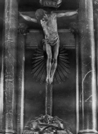 En el reverso, sello de tinta del fotógrafo Julio Cía y anotación manuscrita: "Catedral, Cristo alzado del trascoro / 62". El fotógrafo Julio Cía desarrolló su actividad principal a partir de 1915. La fotografía se encuentra adhesivada a un volumen dedicado a "Navarra. Indice Histórico-Arqueológico. Rutas Turísticas Hispanas" fechado el 30-8-1938. El altar del trascoro, inaugurado el 30-11-1857, fue construido en según proyecto de Pedro Manuel de Ugartemendía y suprimido con el traslado del coro en 1944-1948. El Crucificado, obra de Juan de Anchieta, fue elaborado c. 1577 para la capilla Barbazana, donde estuvo hasta la construcción del altar del trascoro. En la actualidad se conserva en la capilla de San Juan Bautista.